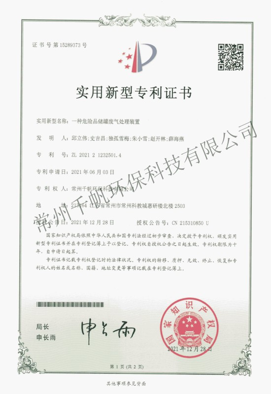 實(shí)用新型專利證書  一種危險品儲罐廢氣處理裝置
